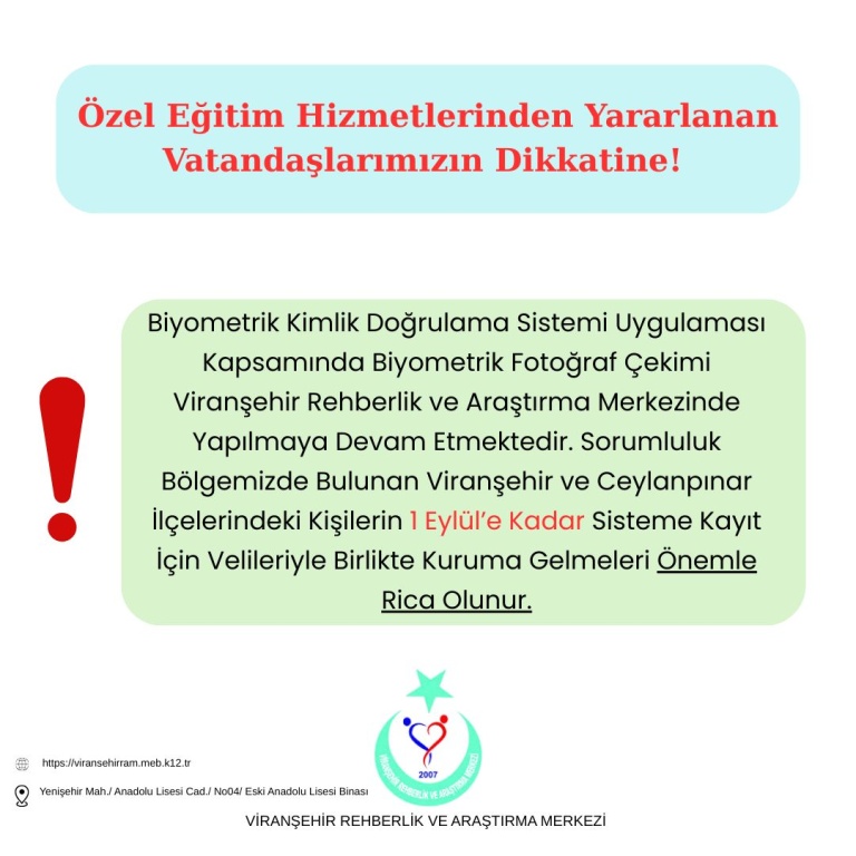 BİYOMETRİK KİMLİK DOĞRULAMA SİSTEMİ UYGULAMASI KAPSAMINDA BİYOMETRİK FOTOĞRAF ÇEKİMİ VİRANŞEHİR REHBERLİK VE ARAŞTIRMA MERKEZİNDE YAPILMAYA DEVAM ETMEKTEDİR. SORUMLULUK BÖLGEMİZDE BULUNAN VİRANŞEHİR VE CEYLANPINAR İLÇELERİNDEKİ KİŞİLERİN 1 EYLÜL'E KADAR SİSTEME KAYIT İÇİN VELİLERİYLE BİRLİKTE KURUMA GELMELERİ ÖNEMLE RİCA OLUNUR.