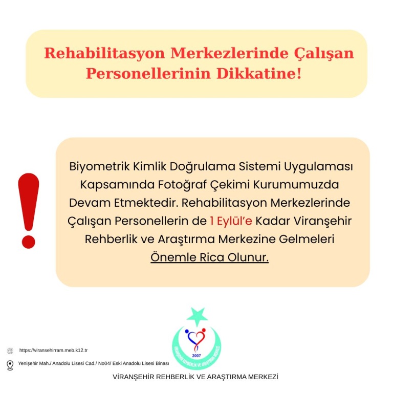 Biyometrik Kimlik Doğrulama Sistemi Uygulaması kapsamında fotoğraf çekimi kurumumuzda devam etmektedir. Rehabilitasyon Merkezlerinde çalışan personellerin de 1 Eylül'e kadar Viranşehir Rehberlik ve Araştırma Merkezi'ne gelmeleri önemler rica olunur.